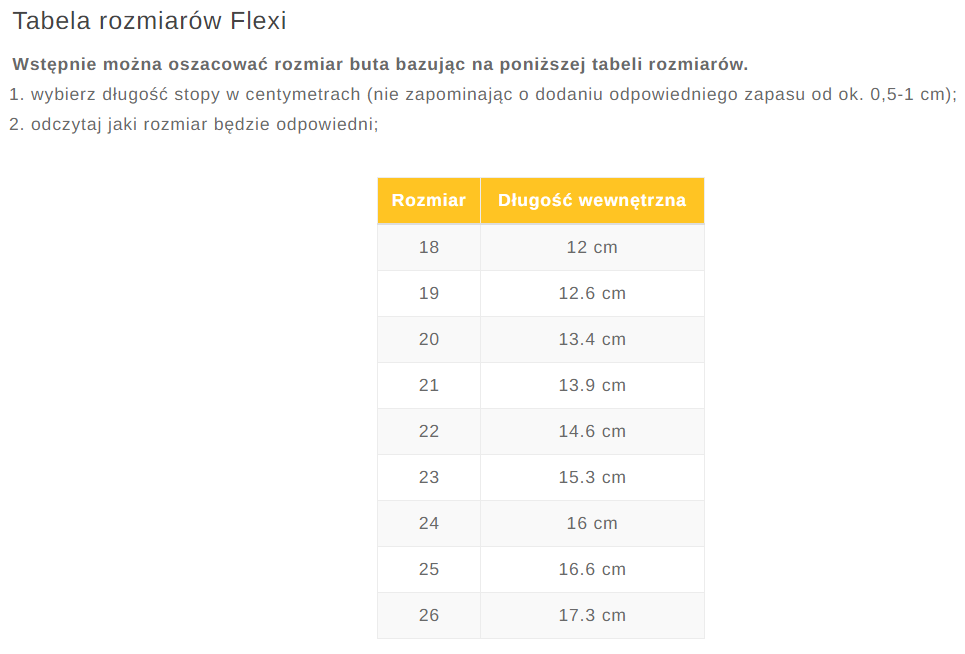 Drogi Rodzicu, pamiętaj, aby zawsze przed zakupem zmierzyć stopę dziecka, a rozmiar bucików Befado dobierać na podstawie wymiarów podanych w tabeli rozmiarowej. Aby buty nie ocierały stópek i dawały pełną swobodę przy każdym kroku i podskoku, koniecznie dobierz obuwie o ok. 0,5-1 cm większe niż stopa dziecka. W razie wątpliwości zachęcamy do kontaktu.