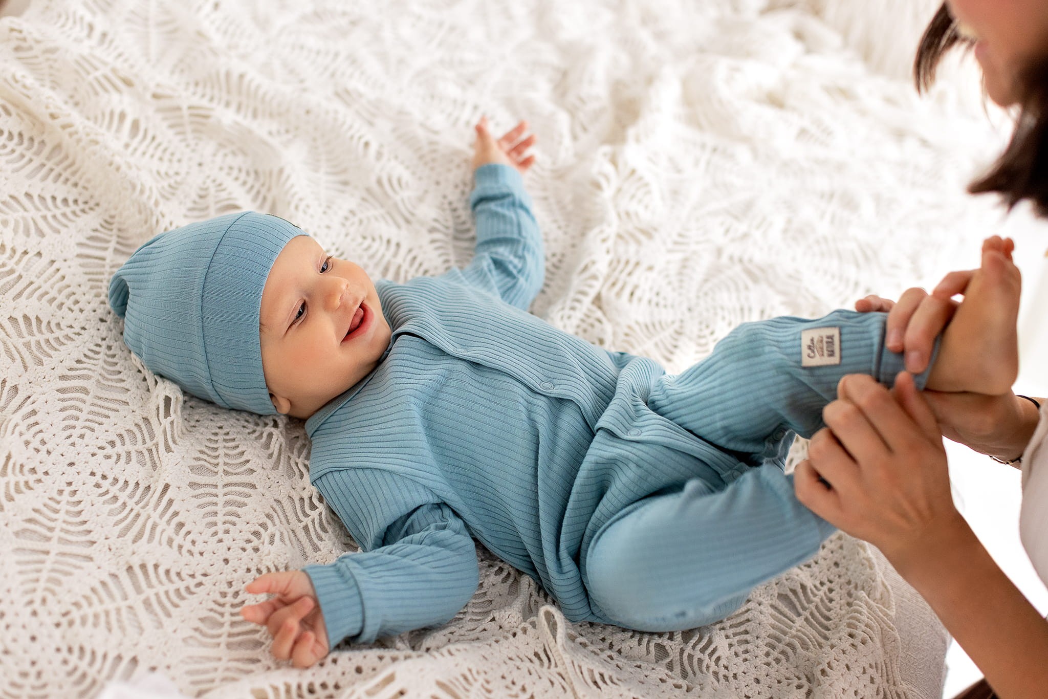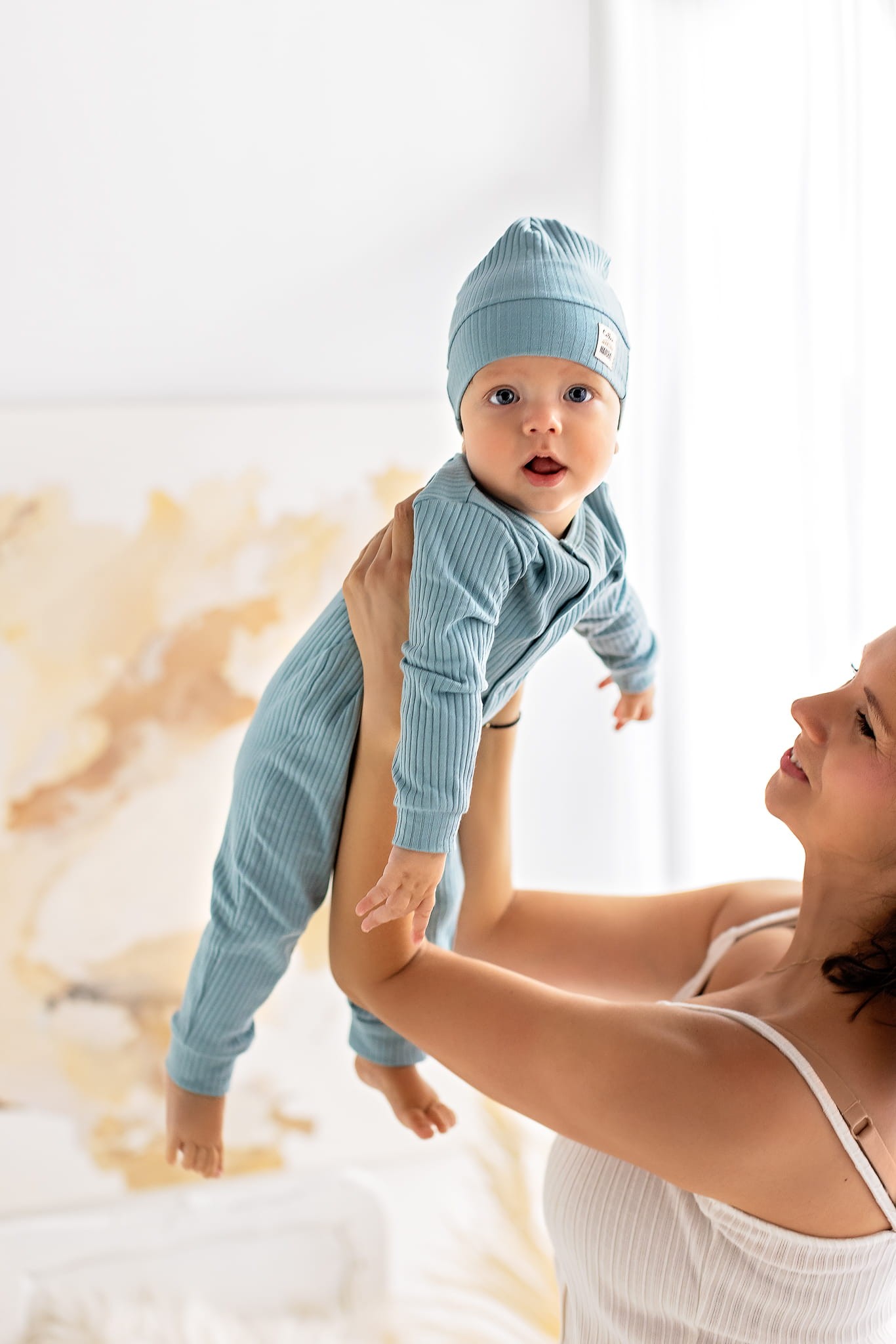 100% bawełna o szerokim prążku, przyjemna w dotyku. Delikatny materiał nie podrażnia i nie powoduje alergii. Sprawdzi się u dzieci z problemami skórnymi. Czapeczki są rozciągliwe, więc łatwo się je zakłada. Tkanina jest przewiewna, zapewnia odpowiednią cyrkulację powietrza, dzięki czemu dziecko nie przegrzewa się. Czapeczki można swobodnie łączyć z pozostałymi ubrankami tworząc każdego dnia ciekawe stylizacje codzienne jak i wyjściowe.