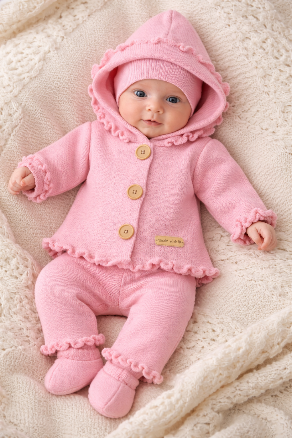 - rękawki jak i nogawki wykończone są falbanką, a także kapturek oraz czapeczka.