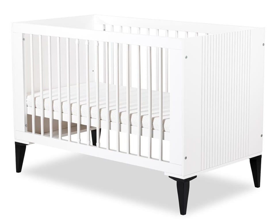 ❤️ Łóżeczko dziecięce MIA idealnie wpisuje się w aktualnie obowiązujące trendy w meblarstwie. Ryflowany szczyt łóżeczka nadaje elegancji i ponadczasowego szyku. Wysokie, drewniane nóżki w kolorze czarnym nadają charakteru i sprawiają, że zestaw wygląda niezwykle nowocześnie. Szczyty łóżeczka wykonane są z wysokiej jakości płyty MDF, która cechuje się wyjątkową trwałością. ❤️