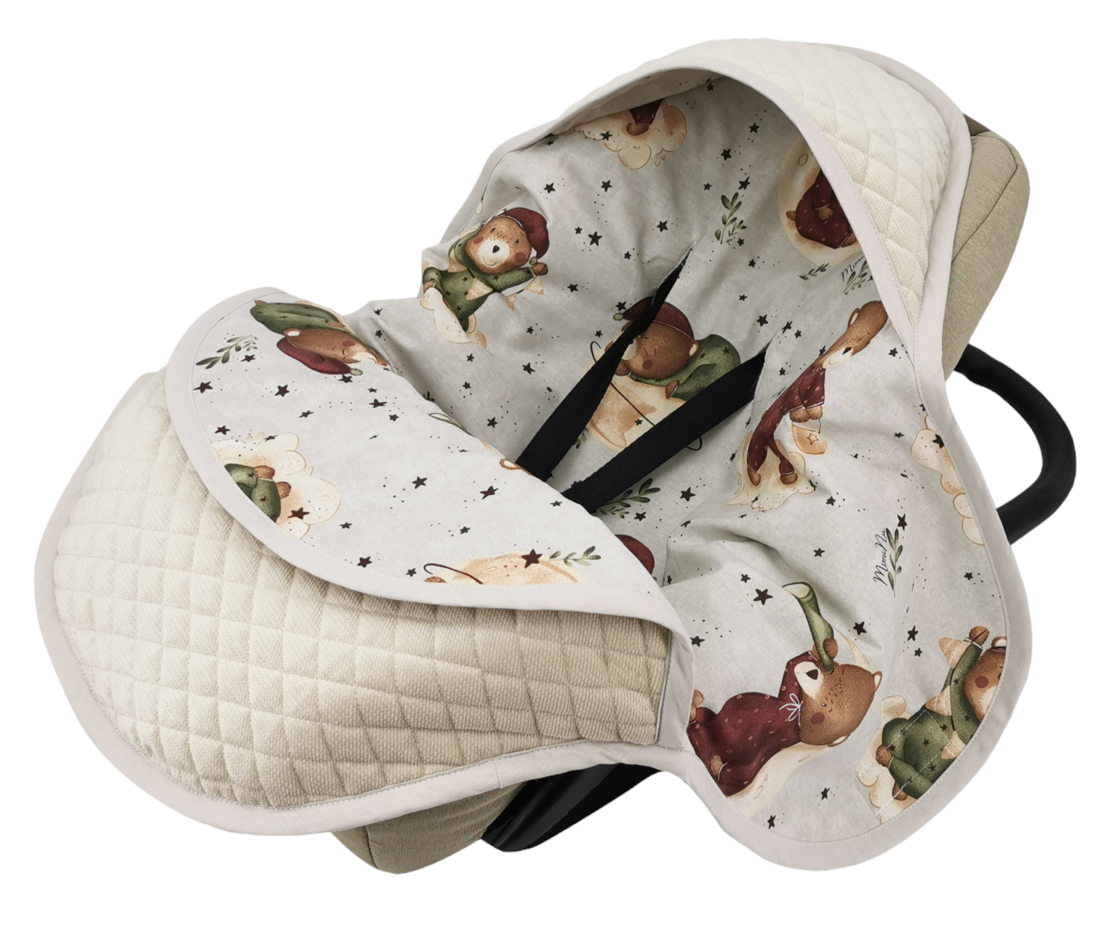 Otulacz do fotelika kubełkowego został wyprodukowany: z tkaniny bawełnianej oraz tkaniny velvet o splocie delikatniejszym niż jedwab. Otuli każdego Maluszka podczas małych i wielkich podróży, dając poczucie ciepła i bezpieczeństwa. Wygodny kapturek przykryje główkę dziecka i w razie potrzeby zakryje wrażliwe uszka. Otulaczek posiada otwory na pasy bezpieczeństwa, dzięki czemu pozostanie w foteliku po wyciągnięciu Malucha. Maluszek jest idealnie otulony i nie marznie podczas podróży. Otulaczek świetnie pasuje do fotelika samochodowego typu nosidełko.