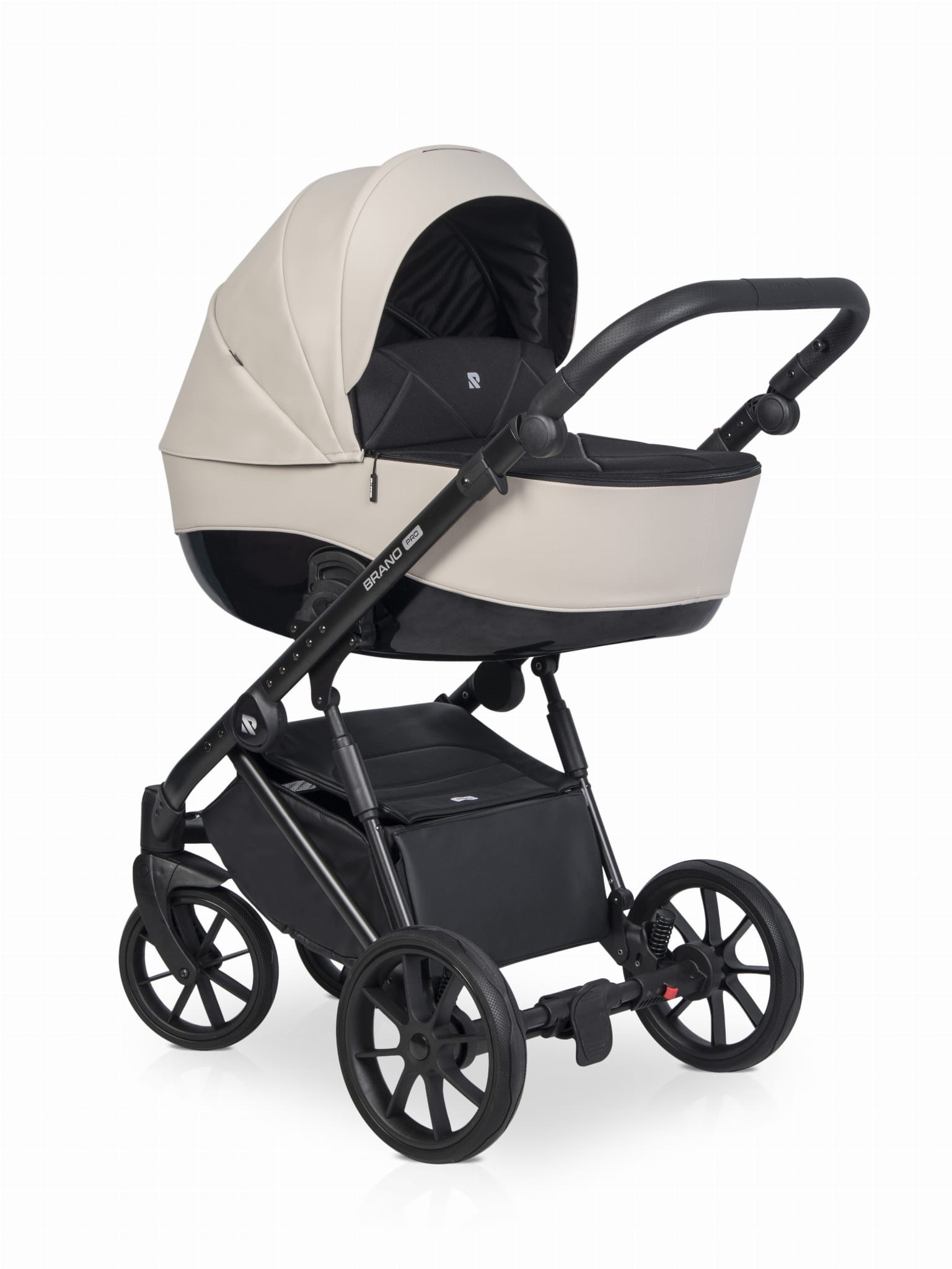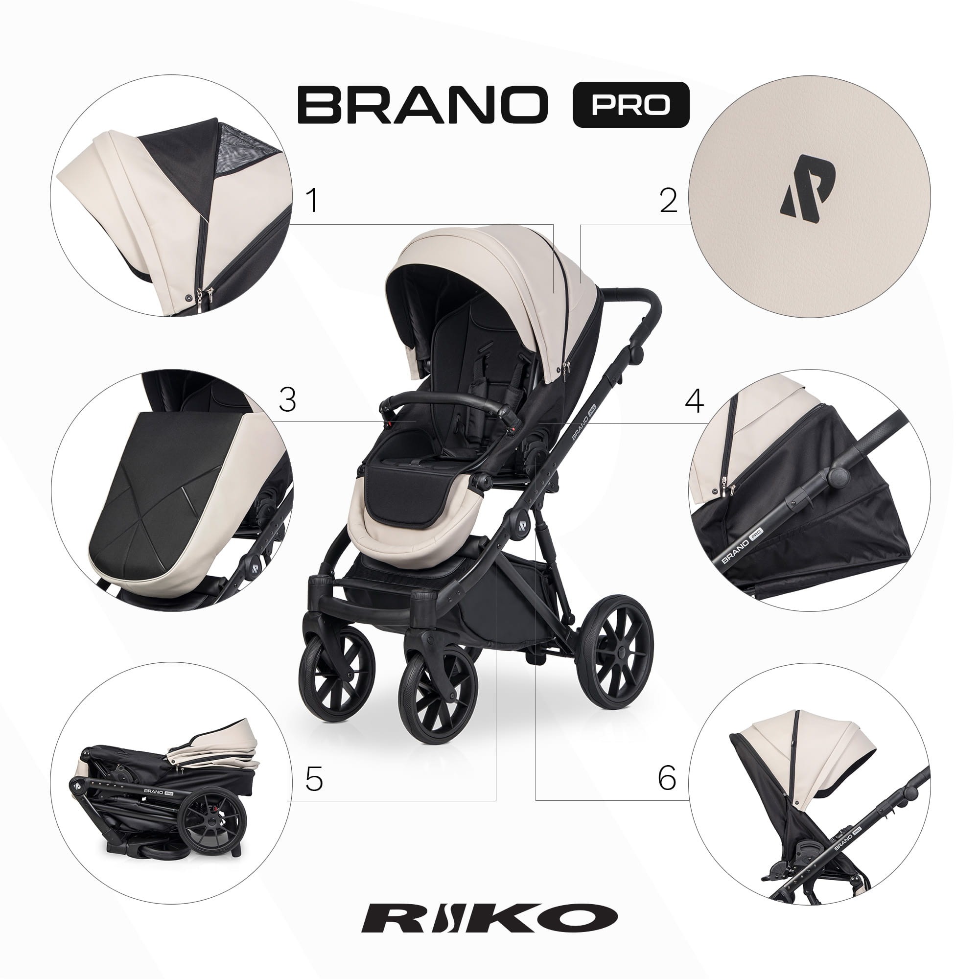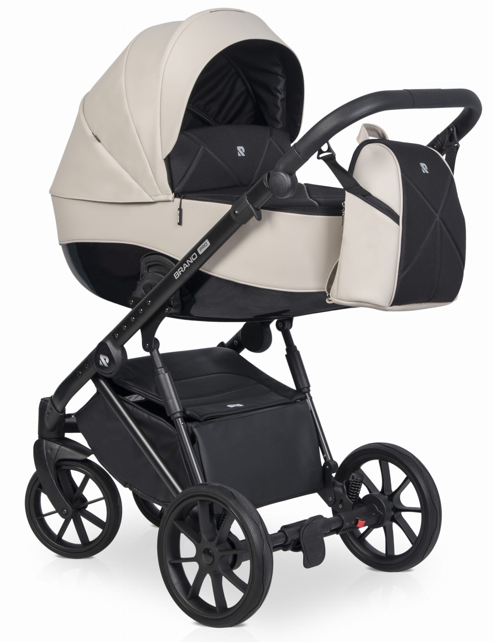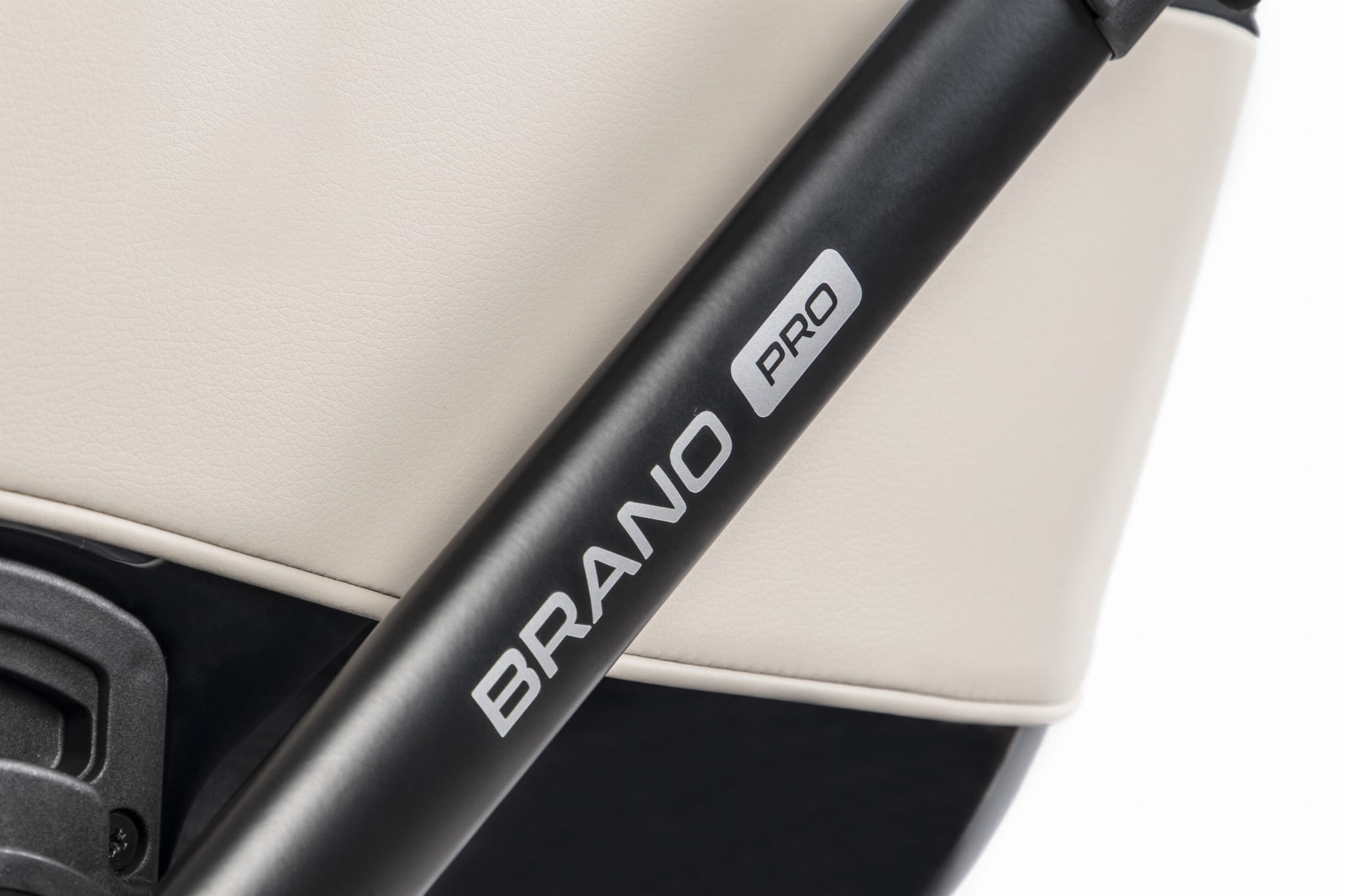 Cechą charakterystyczną wózków z serii Brano jest bezawaryjność i wyjątkowa wytrzymałość, dzięki którym Brano Pro z pewnością posłuży więcej niż jednemu dziecku. Najnowsza kolekcja Riko Brano Pro posiada tapicerkę uszytą z modnej i odpornej na zabrudzenia skóry ekologicznej połączonej czarnymi materiałowymi elementami. Całości dopełnia czarny stelaż ze srebrnymi nadrukami.