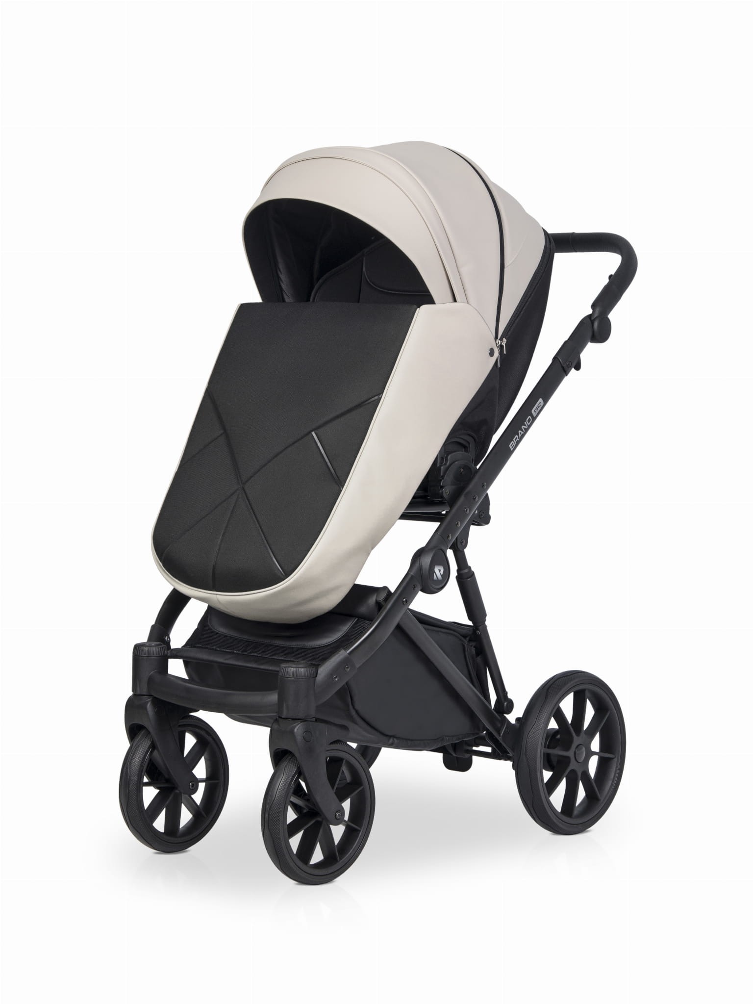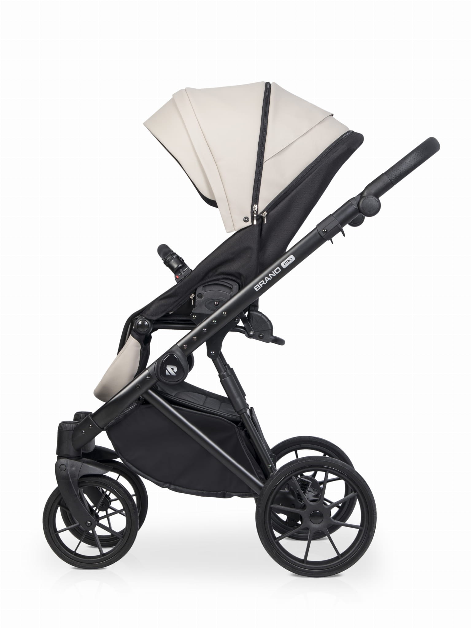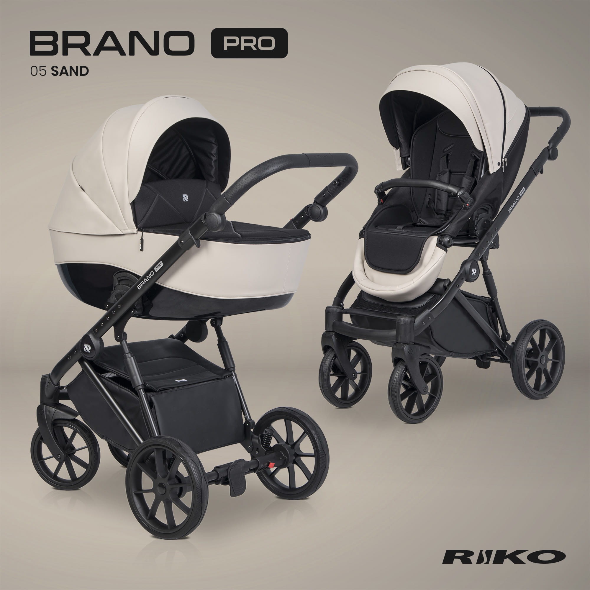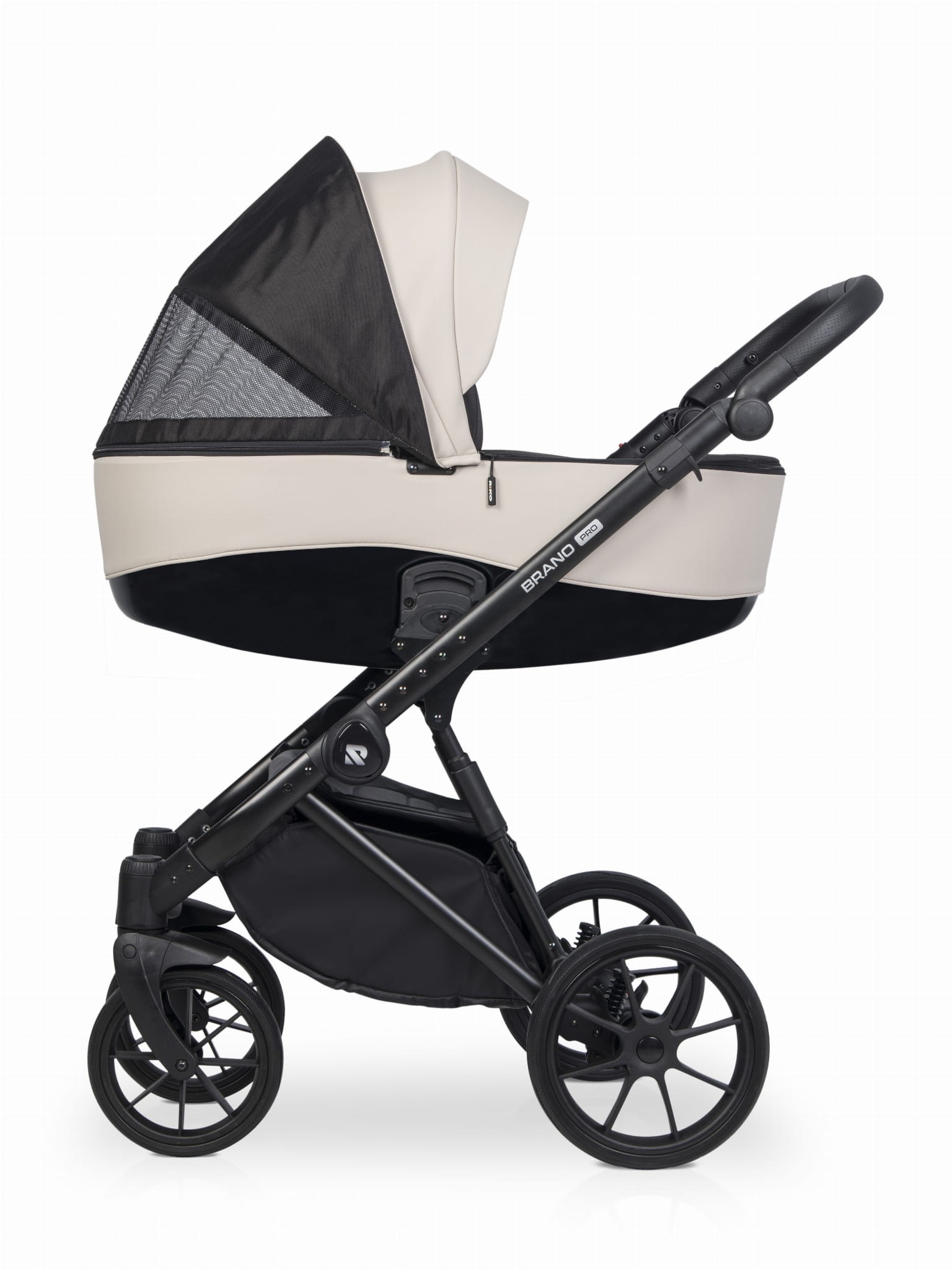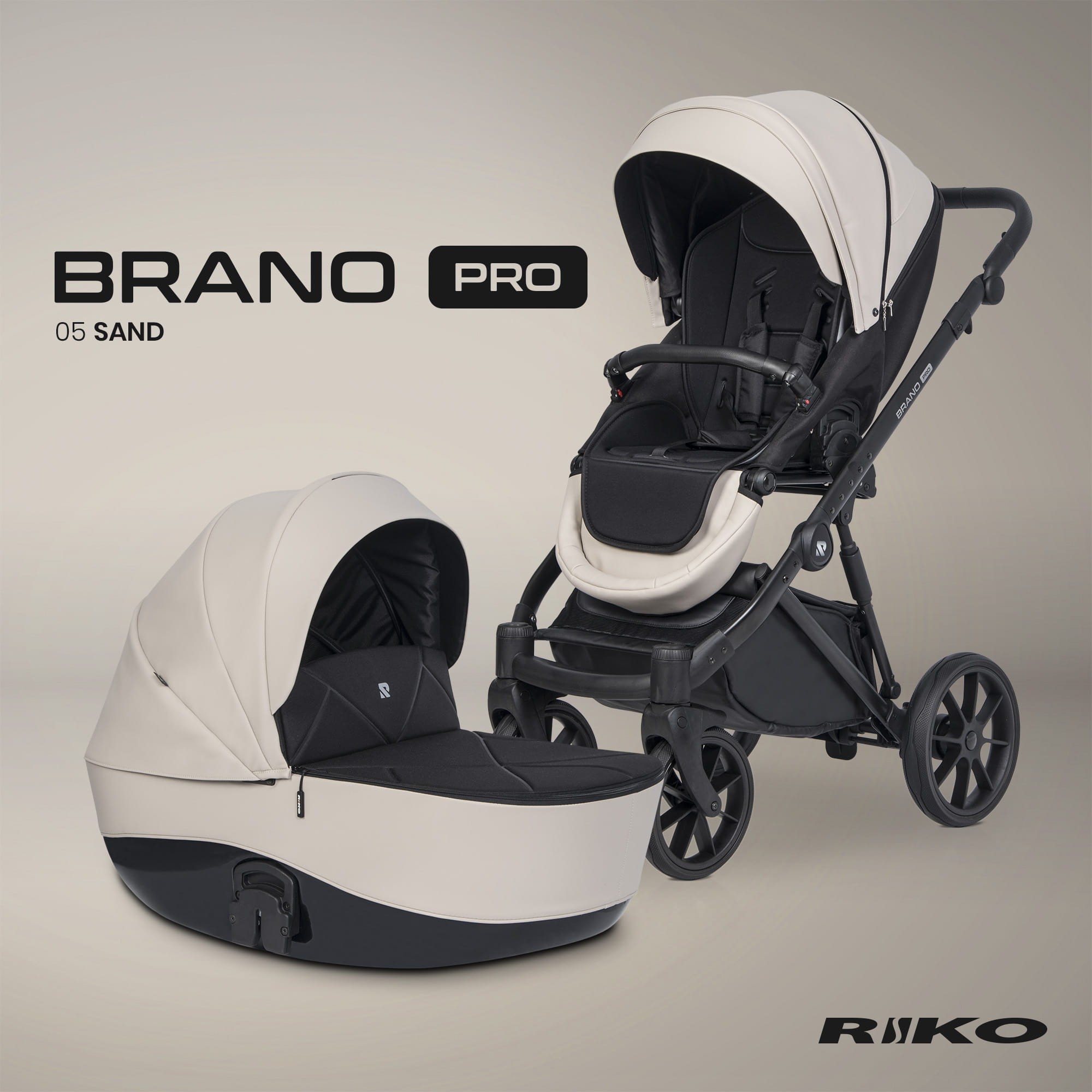 Cechą charakterystyczną wózków z serii Brano jest bezawaryjność i wyjątkowa wytrzymałość, dzięki którym Brano Pro z pewnością posłuży więcej niż jednemu dziecku. Najnowsza kolekcja Riko Brano Pro posiada tapicerkę uszytą z modnej i odpornej na zabrudzenia skóry ekologicznej połączonej czarnymi materiałowymi elementami. Całości dopełnia czarny stelaż ze srebrnymi nadrukami.