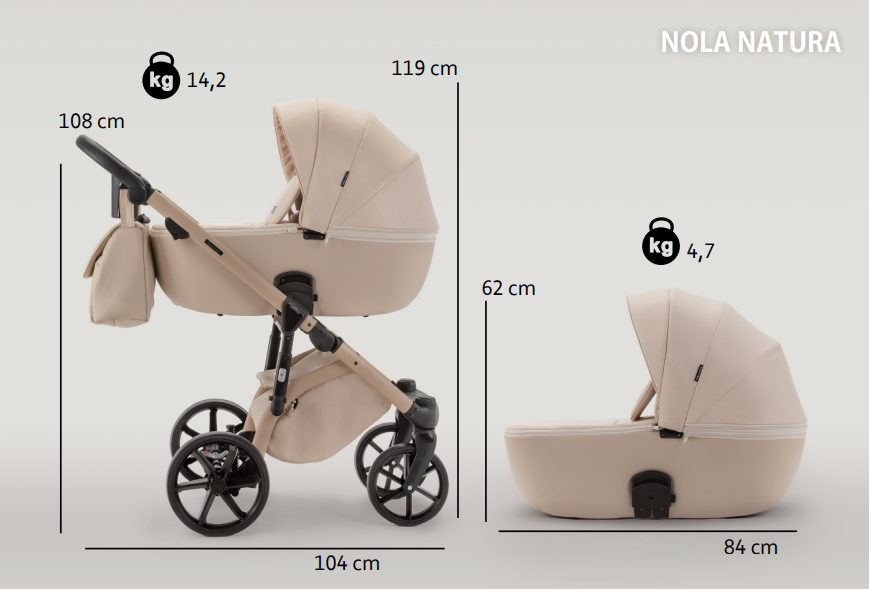 Kolekcję NATURA wyróżniają idealnie dobrane połączenia kolorystyczne tkaniny, ekoskóry, dodatków oraz stelaża. Nola to przystępny cenowo model wózka, który łączy w sobie prostotę ale i praktyczność. Na szczególną uwagę zasługuje doskonała, regulowana amortyzacja znajdująca się w zawieszeniu tylnym oraz w amortyzatorze centralnym. To Ty dostosowujesz amortyzację do swoich potrzeb, a dzięki niej, każdy krawężnik czy polna droga nie będą stanowiły przeszkody w Waszych wspólnych spacerach. Wózek posiada również koła wykonane z pianki poliuretanowej tzw. pianki PU, które są bezobsługowe, nie da się ich przebić i świetnie odnajdą się w każdym terenie, sprawiając, że każda wycieczka lub spacer to czysta przyjemność.